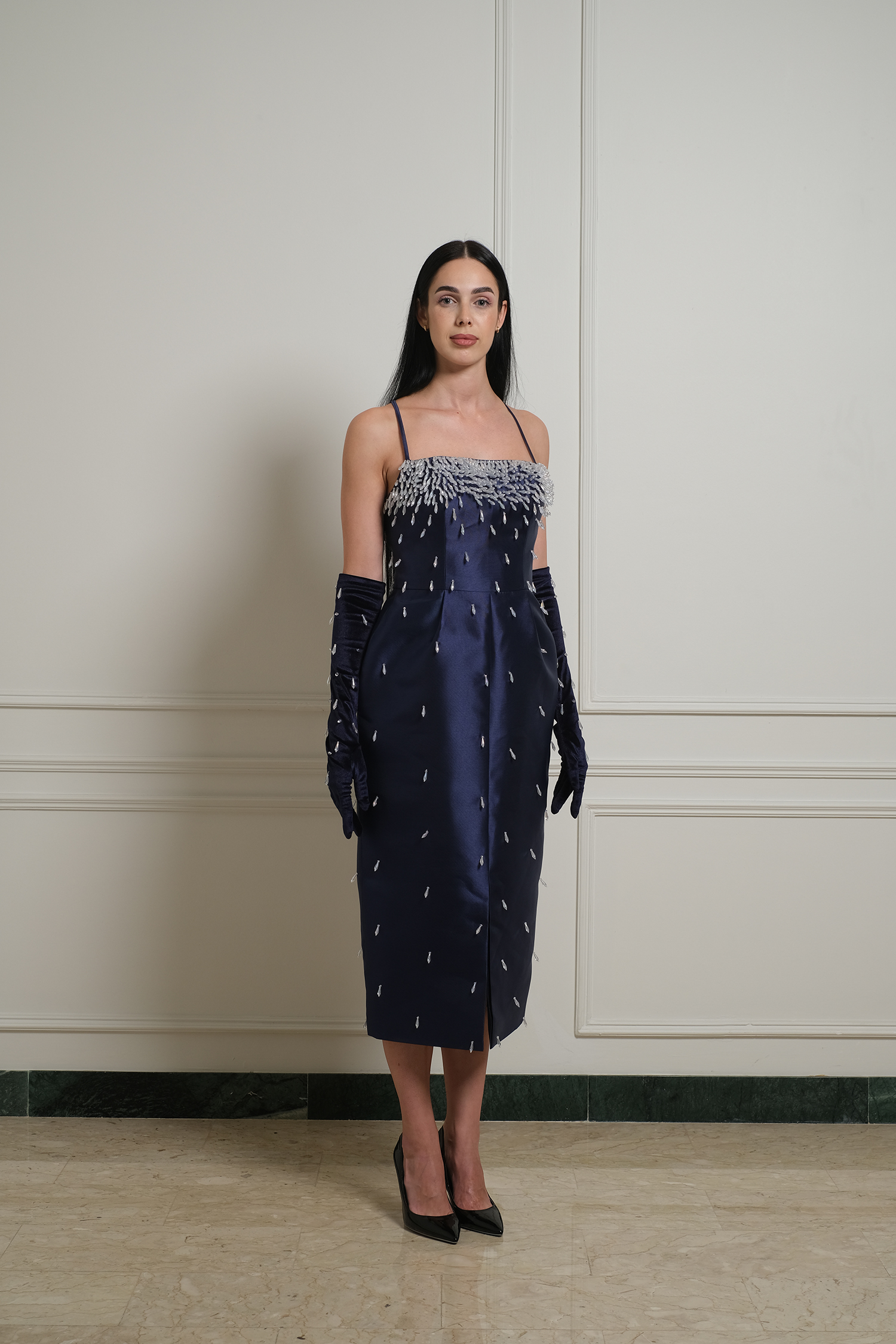 evening cocktail dress with crossed thin straps embellished with raindrop crystals detailed with front slit
